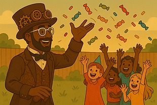 According to urban legend, Three was created the night lightning struck his home, froze the clock at 3 AM, and briefly pulled him through time - stopping his age at 33. The strike also hit the candy on his table, transforming it and inspiring the unique, airy style of the freeze-dried sweets he crafts today. Known as “The Candy Man,” Three spreads joy through his entertainment and his brand, Three’s Sweetie Treets bringing magic, laughter, and delicious treats wherever he goes.